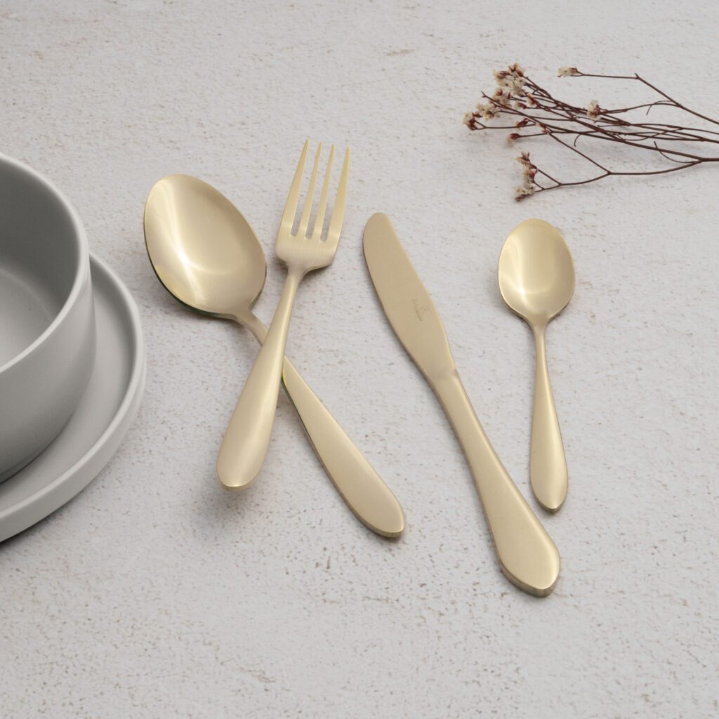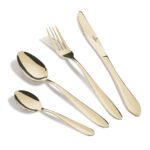 • Material: stainless steel with FULL MIRROR finish • Include: • Table knife 6 pcs 5,0 mm • Table fork 6 pcs 3,0 mm • Table spoon 6 pcs 3,0 mm • Tea spoon 6 pcs 2,0 mm • Color: champagne