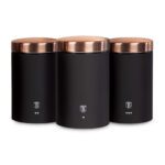 • Material: stainless steel • Include: • Sugar canister Ø11*17,8 cm • Tea canister Ø11*17,8 cm • Coffee canister Ø11*17,8 cm • Outside color: matt black- rose gold