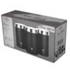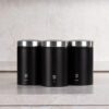 • Material: stainless steel • Include: • Sugar canister Ø11*17,8 cm • Tea canister Ø11*17,8 cm • Coffee canister Ø11*17,8 cm • Outside color: matt black- silver