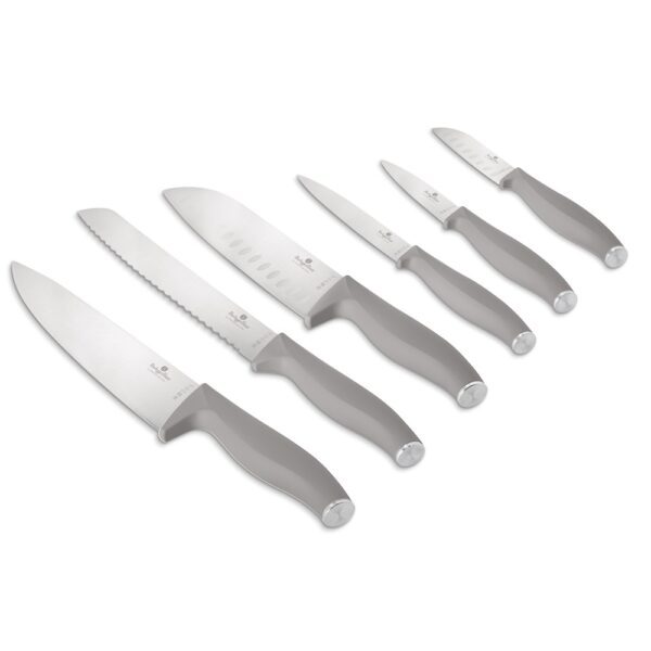 The knives feature a sophisticated matt taupe finish, adding a modern and stylish touch to any kitchen decor. This finish, combined with the high-quality stainless steel construction, ensures that the knives perform exceptionally well while looking beautiful in your kitchen.