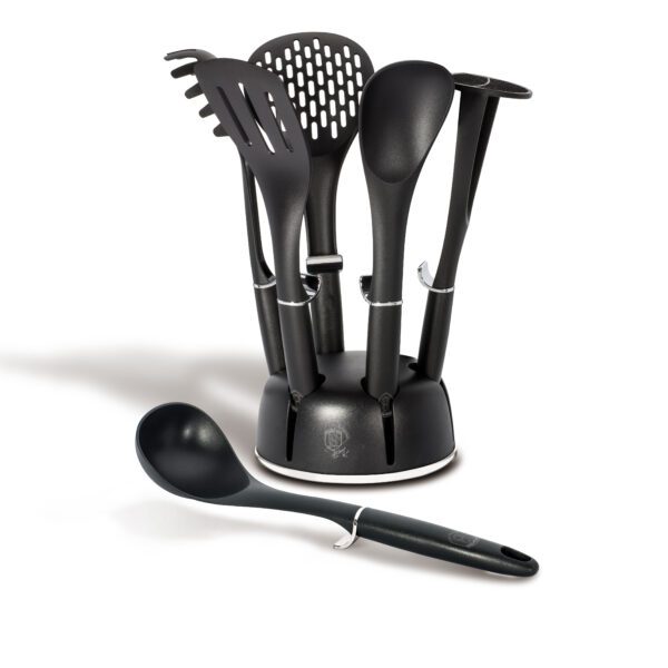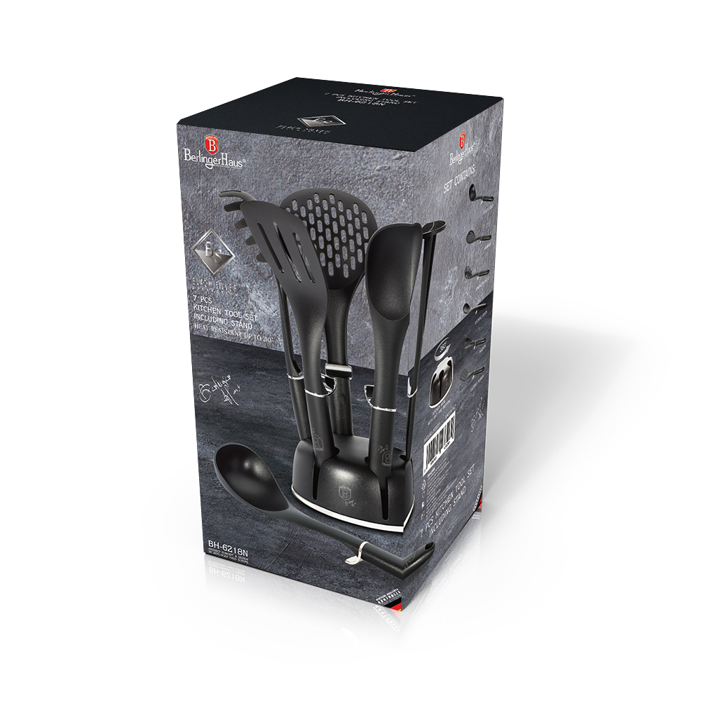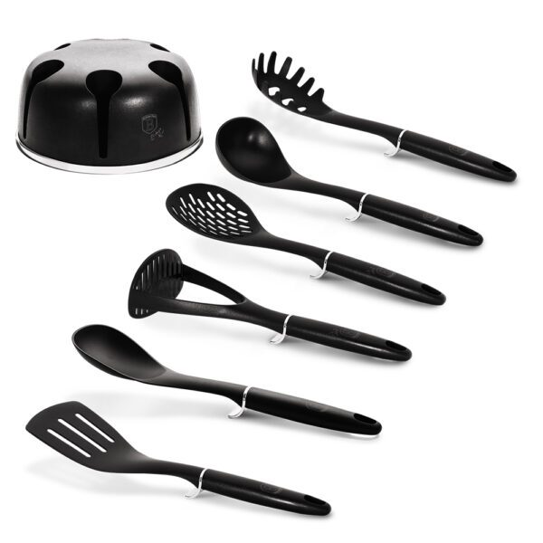 • Material: nylon • Include: • Soup ladle 1 pc • Cooking spoon 1pc • Masher 1pc • Spaghetti ladle 1 pc • Sloted turner 1 pc • Skimmer 1pc • Stand • Color: black- silver