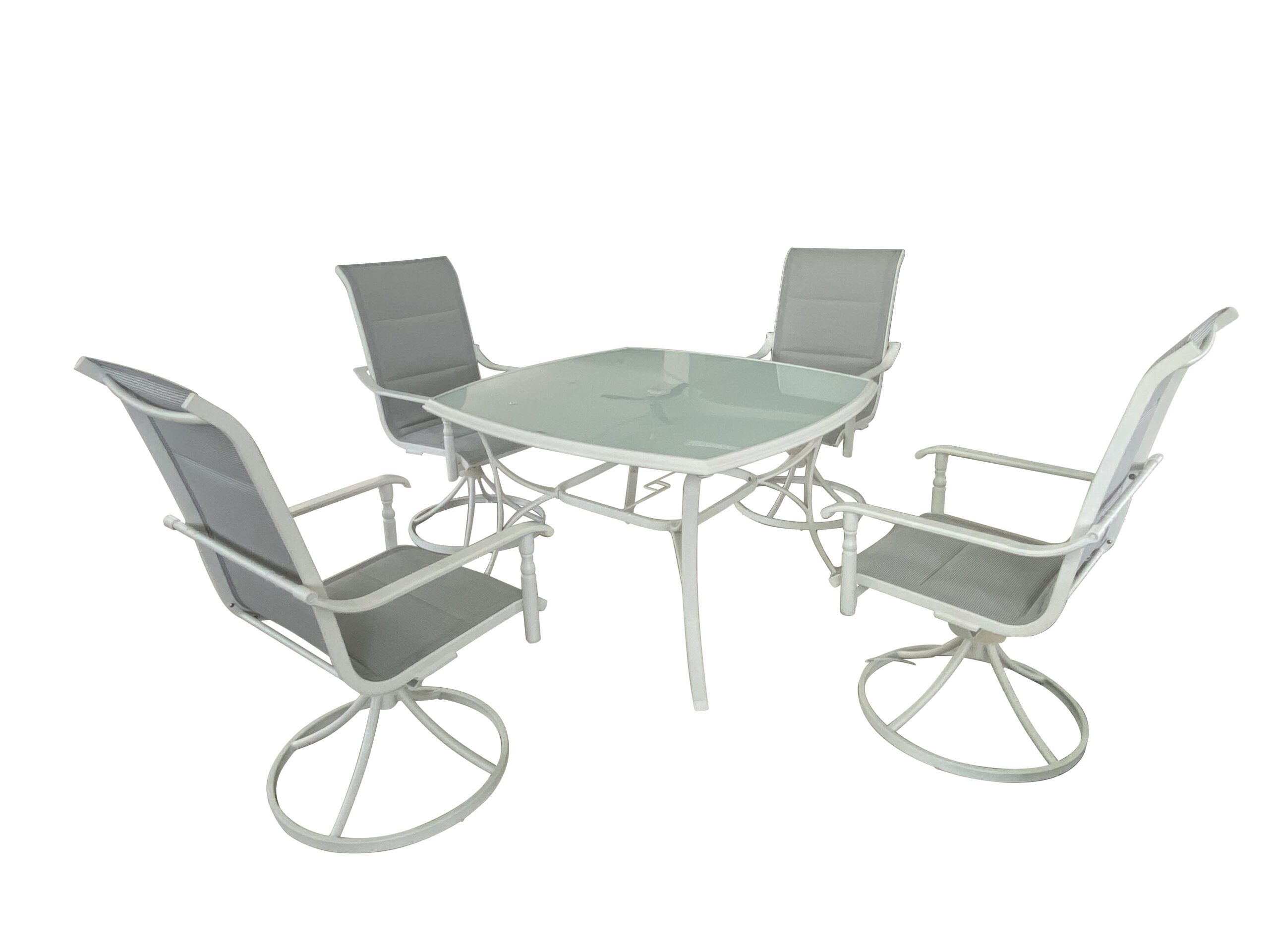 Create the perfect outdoor dining experience with the Ashbury White 5-Piece Swivel Dining Set. Combining durable steel frames, comfortable swivel chairs, and a spacious glass-top table, this set offers both style and functionality for your patio, deck, or garden gatherings.