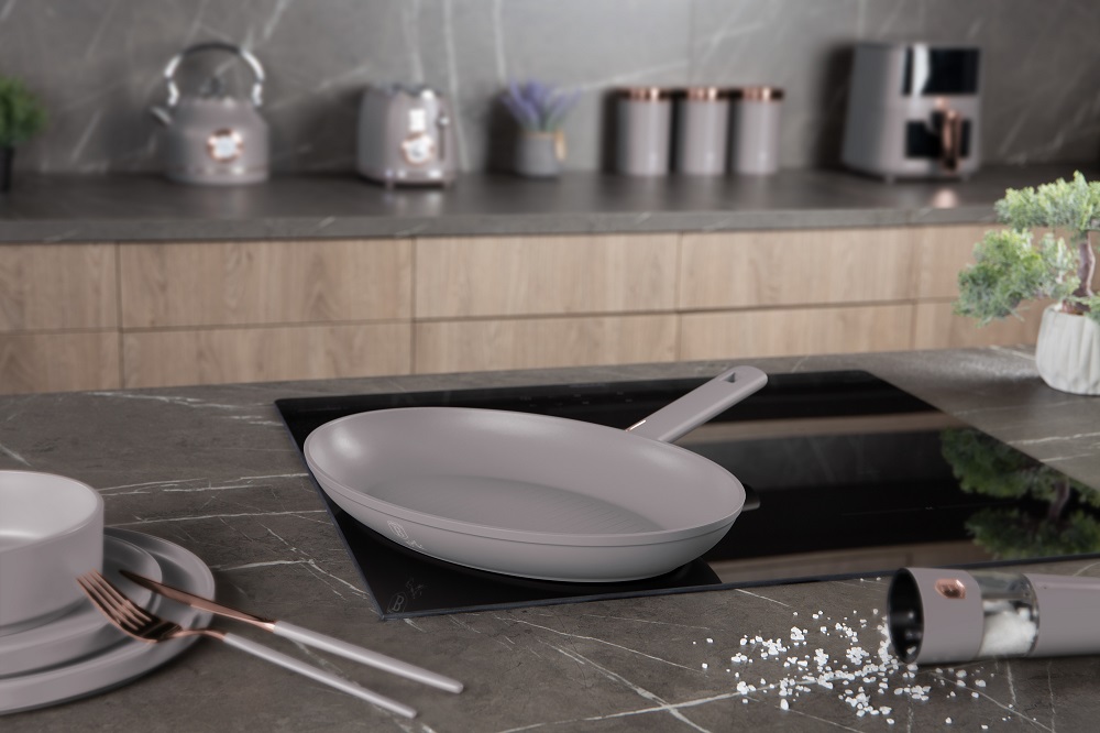 The pan features a stay-cool ergonomic soft-touch handle, which ensures a comfortable and secure grip, even when the pan is hot. Its minimalist style and matt finish not only add to its aesthetic appeal but also make it easy to handle.
