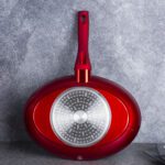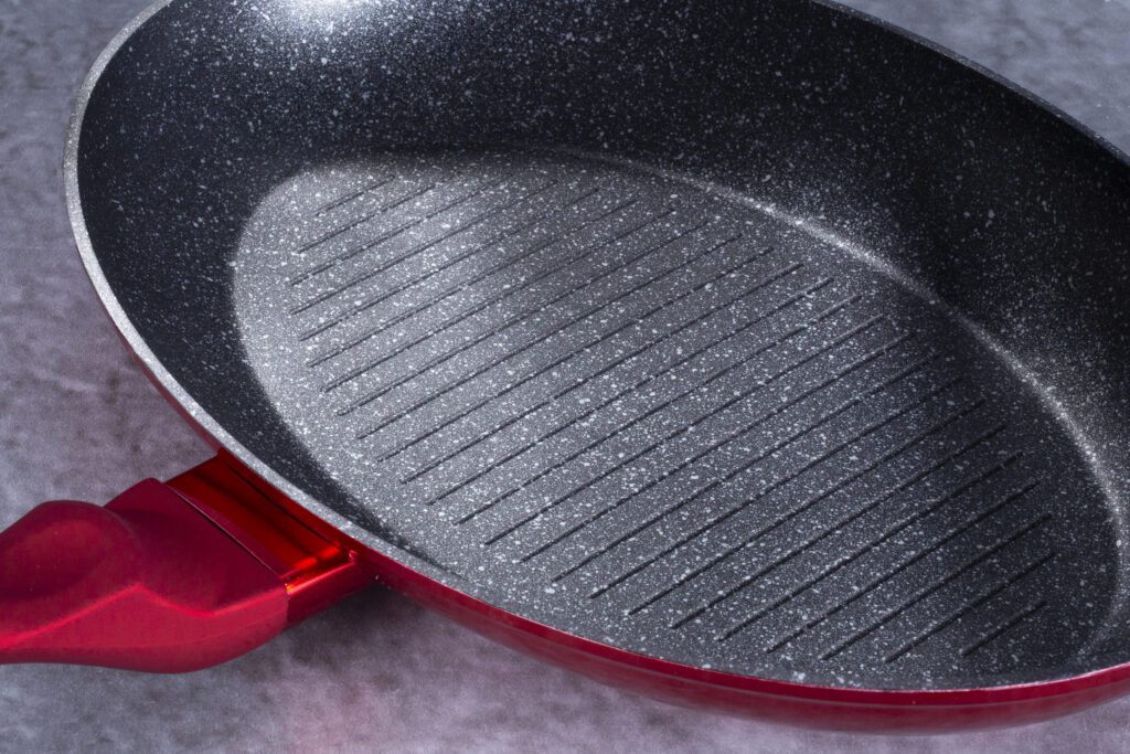 Grill pan for fish with a marble surface in a unique design. For grill pans, the inner surface is ribbed, which mimics a traditional grill grate. The grooves remove the excess fat, which, together with the juice from the meat, is retained between them.
