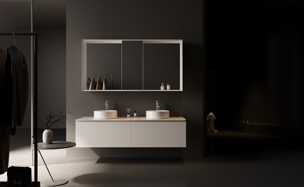 - Illuminated Mirror Cabinet: Wide 1560×800mm mirror cabinet with integrated LED lighting, offering functional illumination and hidden storage in one streamlined piece.