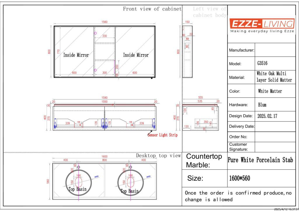 - Mirror Cabinet: 1560 × 800mm with Integrated LED Lighting