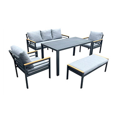 - Materials: Aluminium frame, polyester cushions, faux wood armrest accents