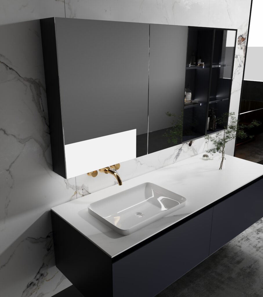 - Innovative Mirror Cabinet: Large 1550 × 800 mm LED mirror cabinet offering expansive storage behind the mirrors, integrated lighting for enhanced visibility.