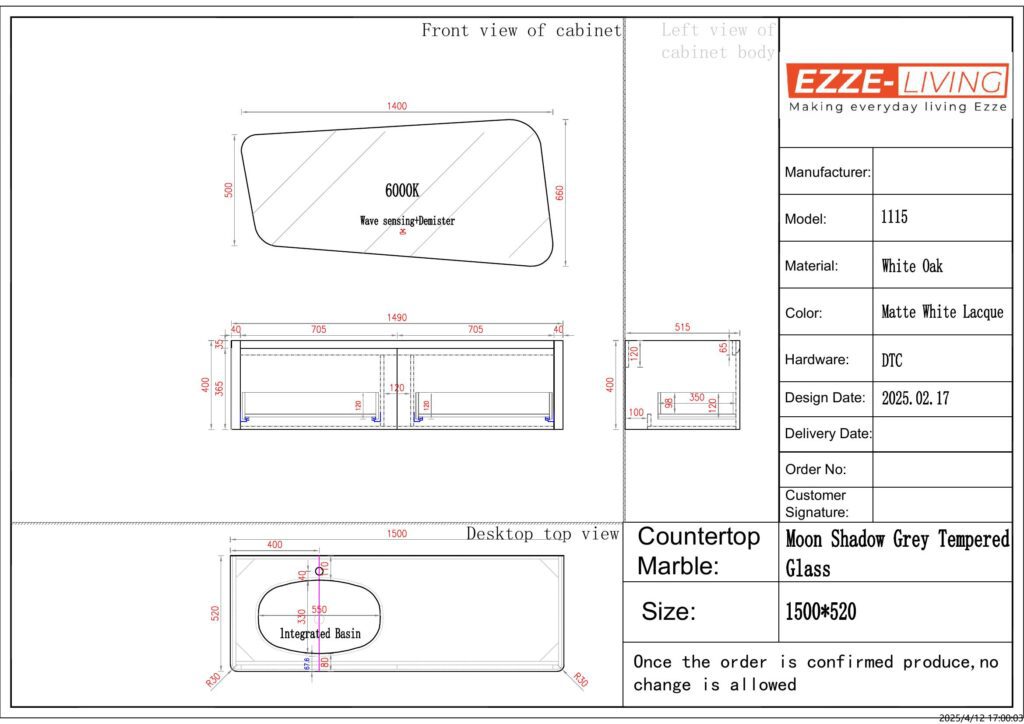 - Dimensions (Vanity): L150 × W52 × H40 cm