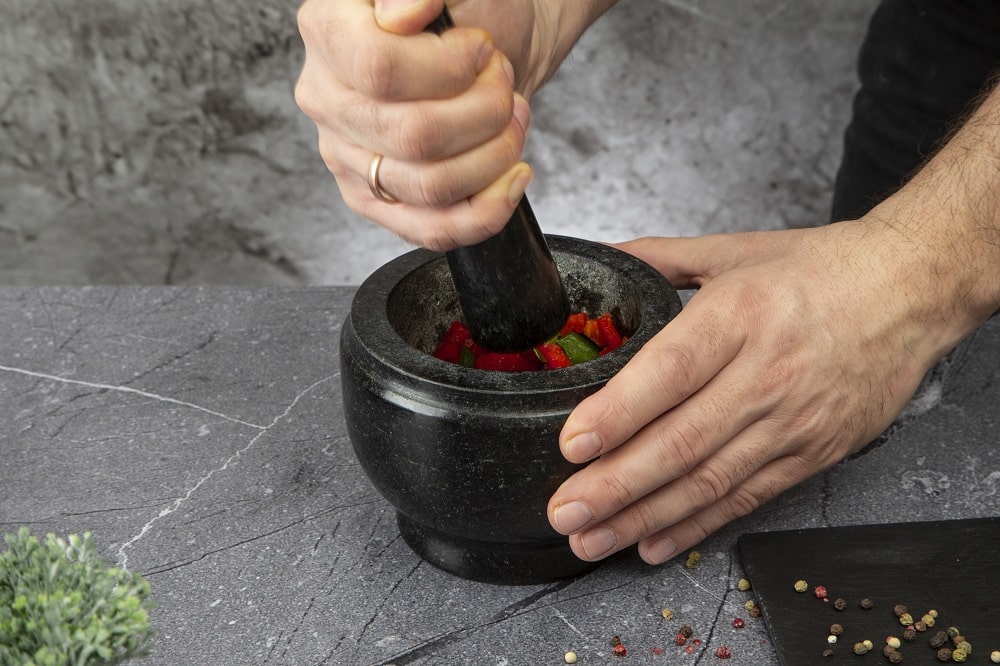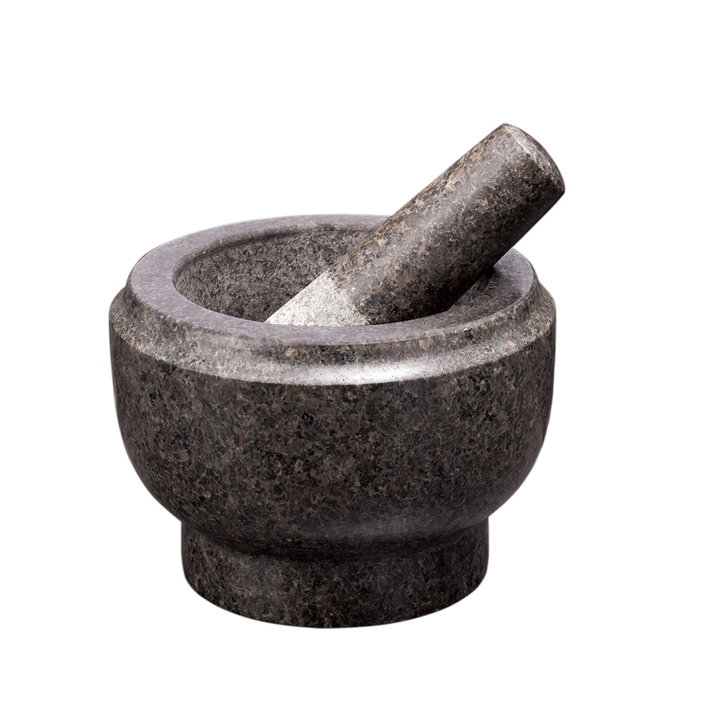 - Carved from genuine granite, this pestle and mortar set boasts exceptional durability and effectiveness. The solid stone construction ensures that flavors and aromas are perfectly ground and blended, releasing their full potential.