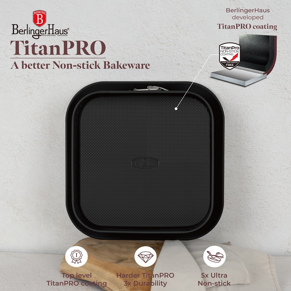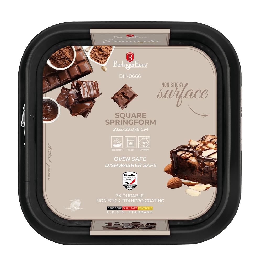TheĀ Berlinger Haus BH8666 Leonardo Square SpringformĀ is designed to make your baking experience both effortless and stylish. Made fromĀ heavy-grade carbon steelĀ with a durableĀ titanPro non-stick coating, thisĀ 28 x 28 cm panĀ ensures even heat distribution, seamless cake release, and quick cleanup. ItsĀ matte bordeaux finishĀ adds a refined touch to your bakeware collection, perfect for baking square cakes, brownies, and layered desserts.