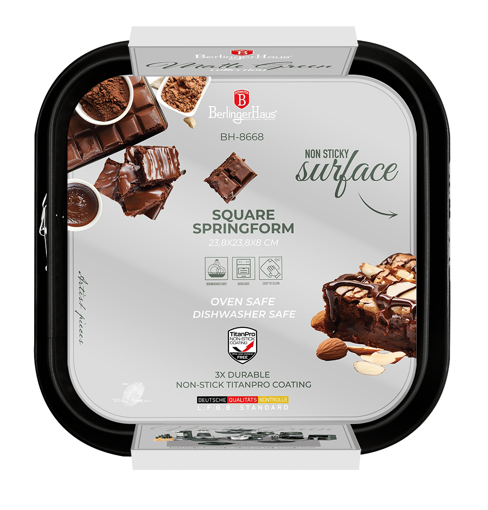 TheĀ Berlinger Haus BH8668 Matte Green Square SpringformĀ is the ultimate addition to your bakeware collection, designed to help you create perfectly shaped cakes, brownies, and layered desserts. Made fromĀ heavy-grade carbon steelĀ with aĀ titanPro non-stick coating, this pan guarantees even baking, easy food release, and simple cleanup. Its elegantĀ matte green finishĀ brings a modern, stylish touch to your kitchen.