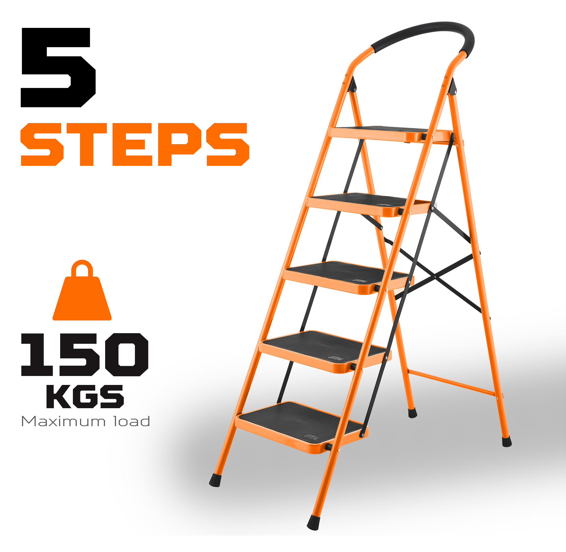 5 steps Material:steel Maxium load :150kgs Step size: 380x260mm Open Size: 495x1085x1390mm Folding Size: 495x60x1715mm Packing : color paper with plastic bag